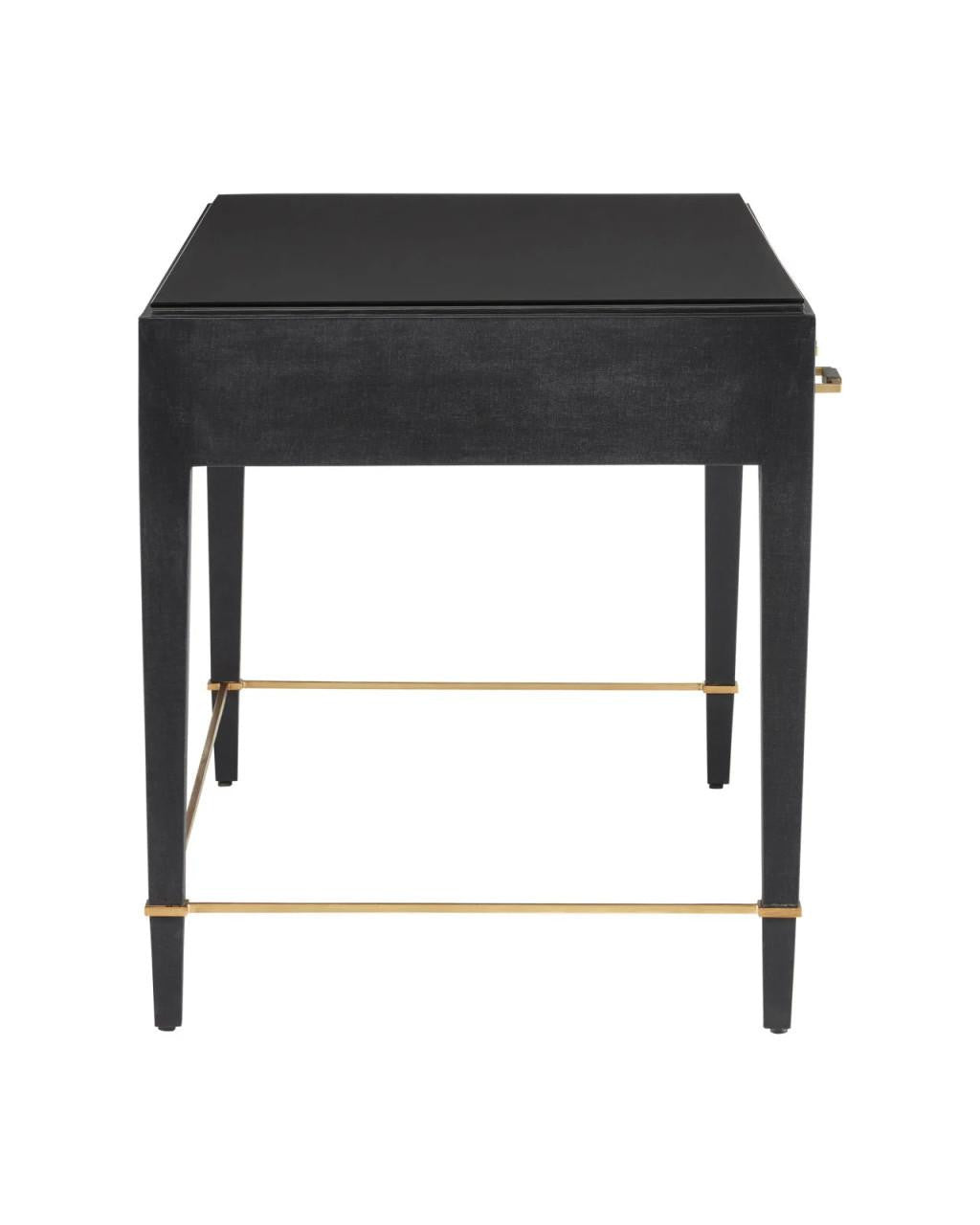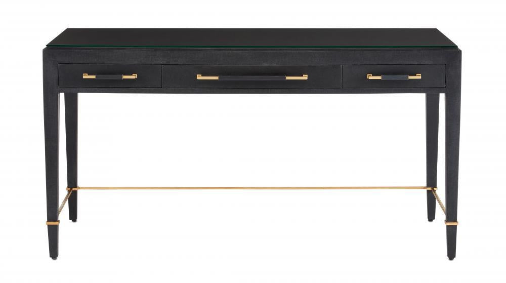 The Verona Black Large Desk is made of mahogany that has been covered in a black lacquered linen. It has a touch of gold on the champagne-finished metal detailing. This is one of our pieces that proves the brilliance of our design team, as the stretchers that clasp each leg are beautifully rendered to create a continuous design detail from leg to leg. Other features are adjustable glides and solid mahogany dovetail drawers.