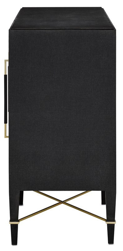 X marks the spot when the Verona Sideboard is introduced into a room. The black beauty with its sexy touch of gold is covered in black lacquered linen that is accented with champagne-finished metal detailing. This sideboard has so much style, it will be the scene of many a movable feast. Design details include linen-wrapped metal handles, soft-close door hinges, six adjustable shelves, adjustable glides, cord management and an anti-tip kit. There are several pieces in the Verona family of furnishings.