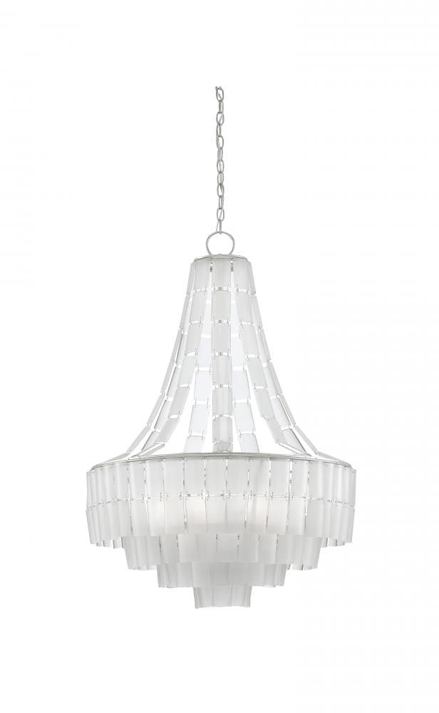 Cascading from the circular frames of the Vintner Blanc Chandelier are individually-cut pieces of frosted glass made from recycled bottles, any number of which could have been at the scene of a celebratory toast! The texture of the frosted surfaces beautifully complements the contemporary silver leaf finish on the wrought iron frame of this seven-light fixture. This is one of three lights in the Vintner family. If you prefer a rounder chandelier, take a look at our Sommelier Blanc chandelier with the same glass.