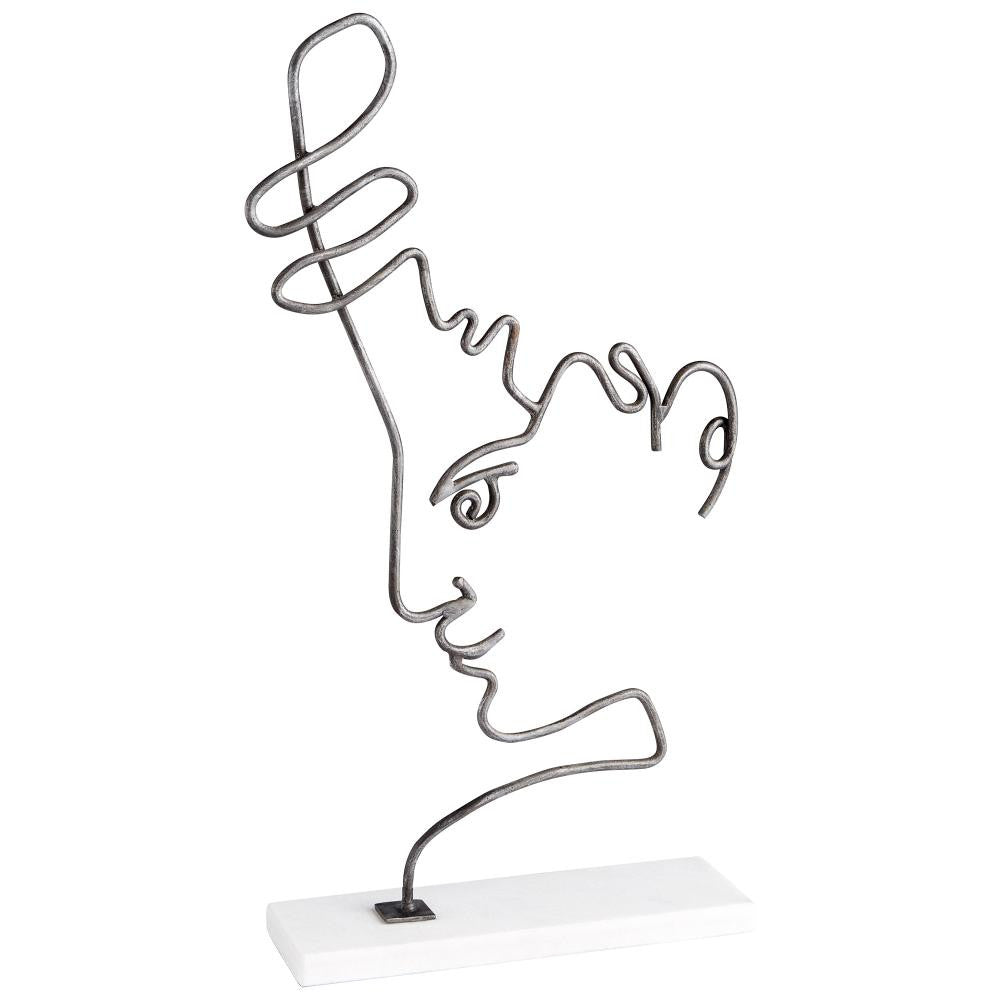 This profile of a human face is composed entirely of iron in a whimsical and abstract pattern. The expressive accent is perched atop a rectangular, solid granite base. The contrasting gray and white finishes help this sculpture stand out, making it a great addition to any office shelf display, coffee table design, or commercial lobby styling.