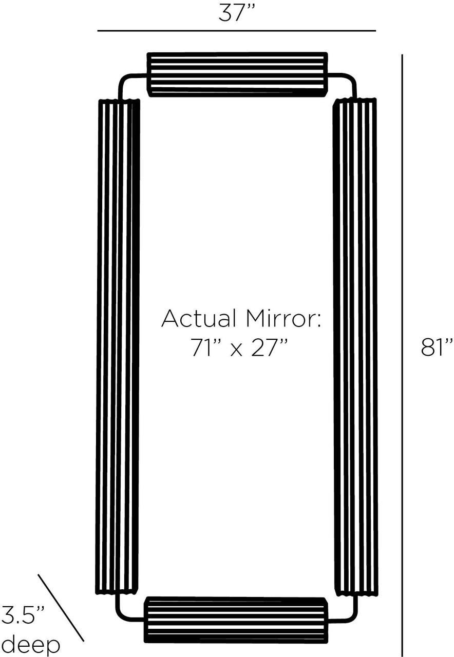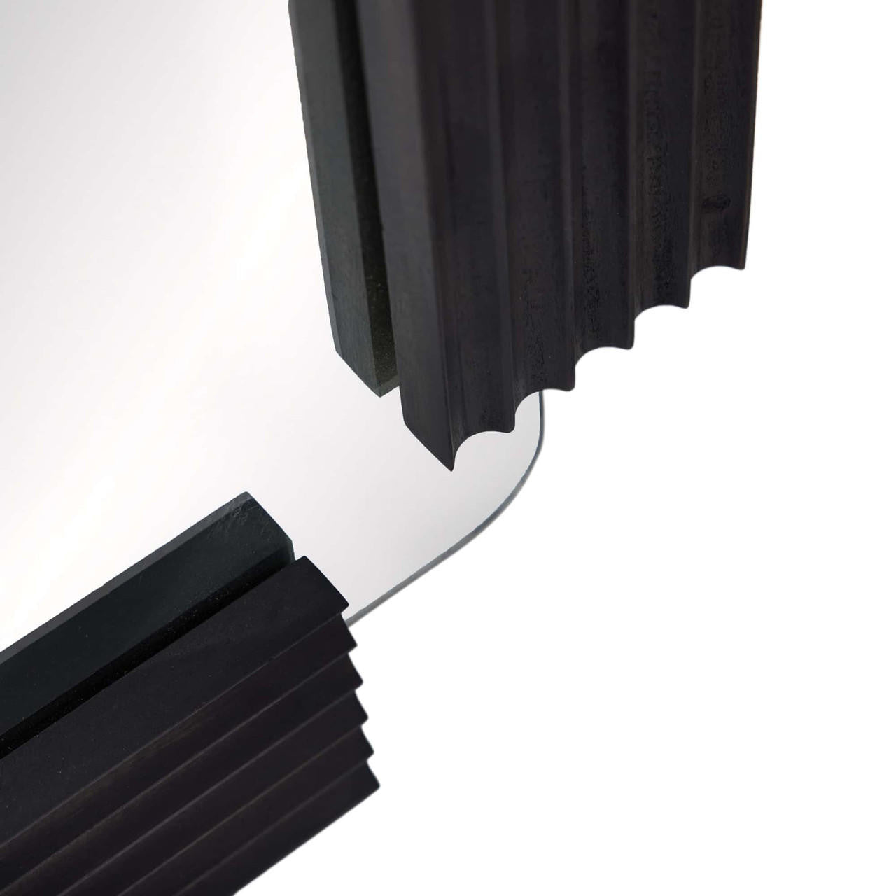 The weller floor mirror is crafted of carved, ebonized mango wood blocks that cradle a rounded corner, inset mirror. The intersection of materials creates dimension and the illusion that the mirror is floating on the wall. The piece is fitted with a cleat for hanging. Finishes will vary.