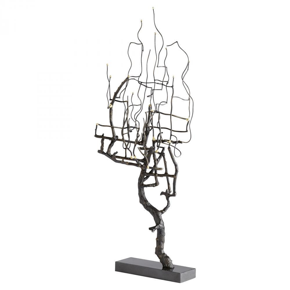 The Wilting Brass is a steely depiction of a wilted tree in which the branch ends have been tipped with a glistneing gild. Its multitudinous form creates both an ephemeral density and airiness. The brass sculpture is elegantly mounted on a glossy cuboid base.